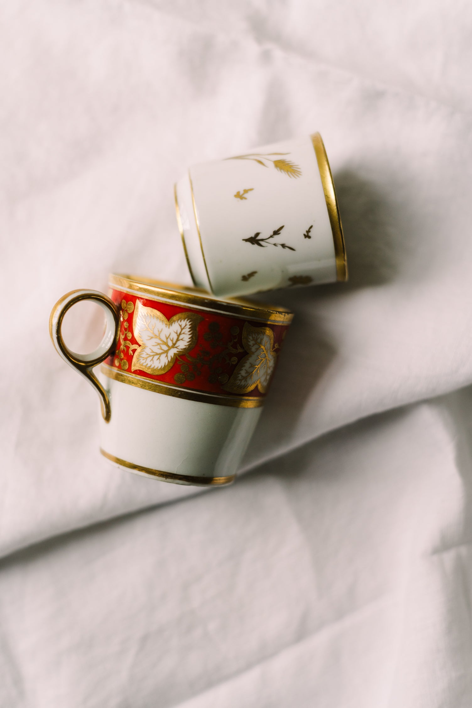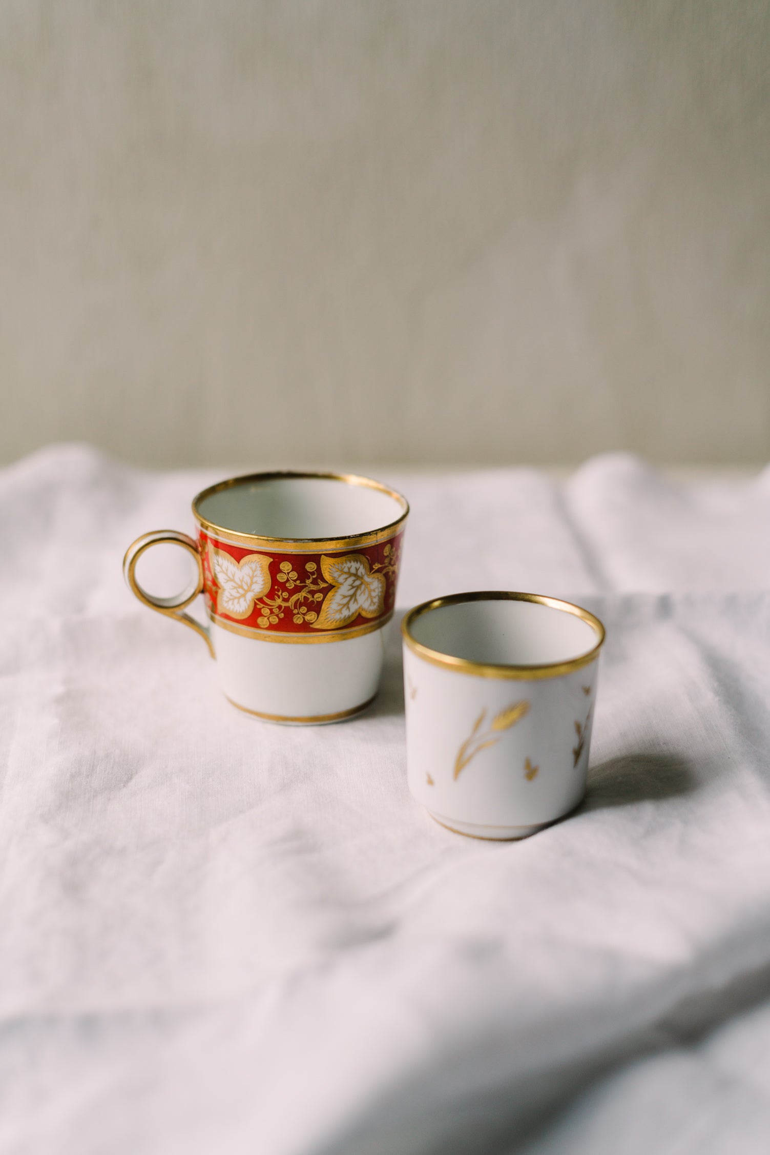Pair of gilded cups from different centuries. The small floral demitasse cup features hand-painted sweet florals around the base most likely from mid-century France as the maker is unknown. Its larger partner is from the Georgian era with a beautiful red-orange band accented with grapevines. We picture these on an open-shelf with brushes or pens. We love the mismatched feel of this beautiful pair.