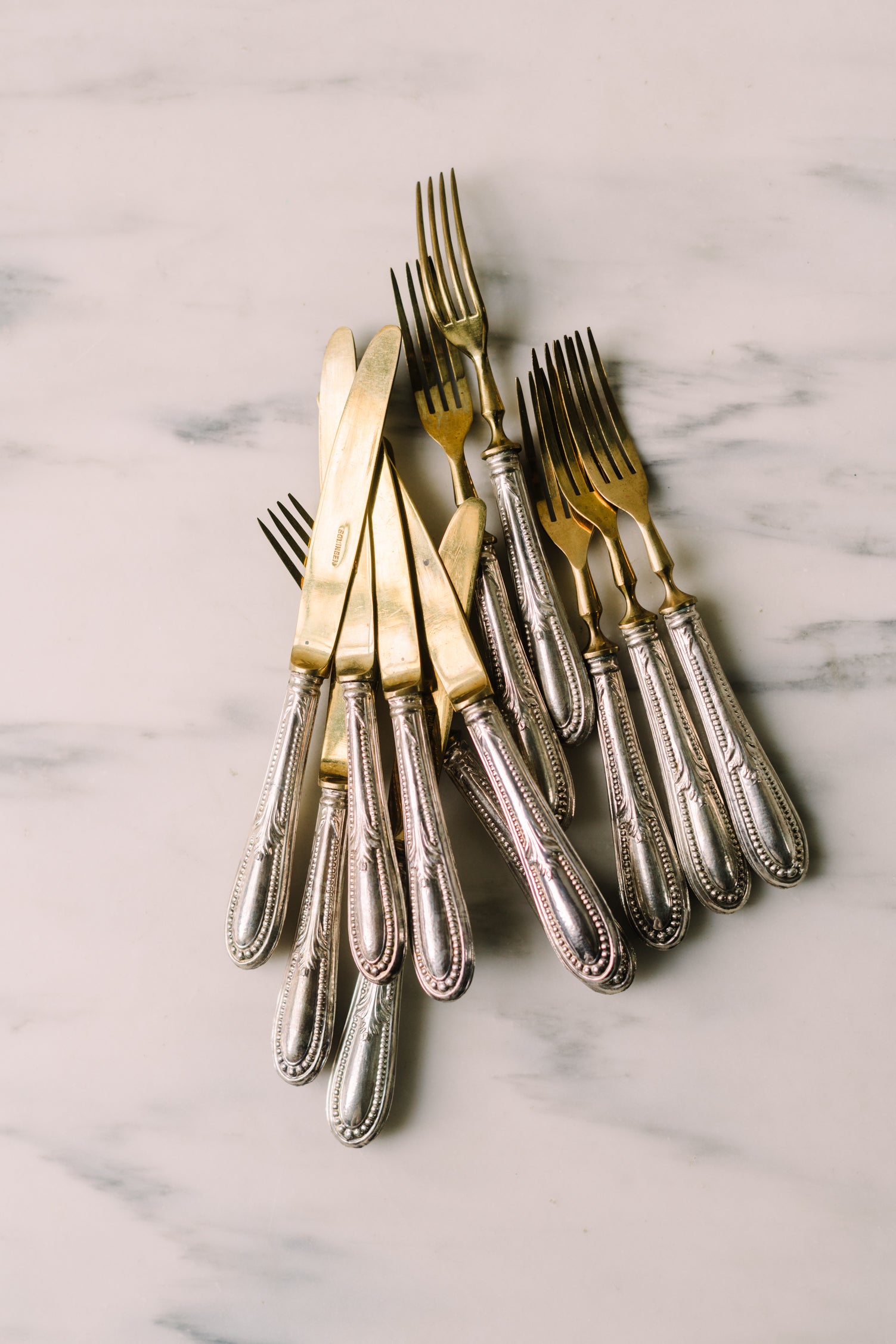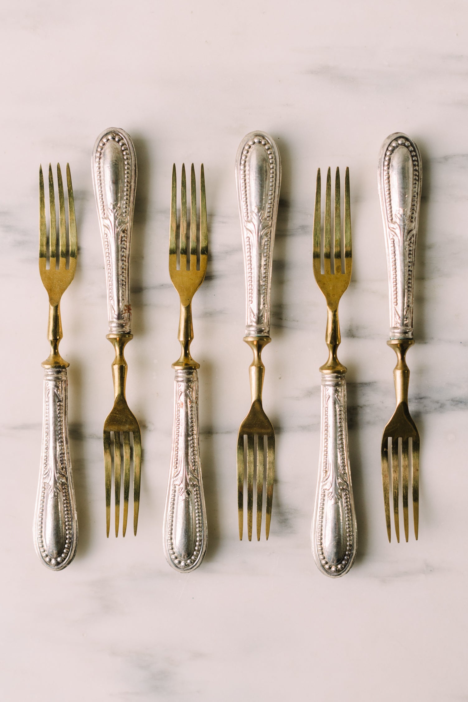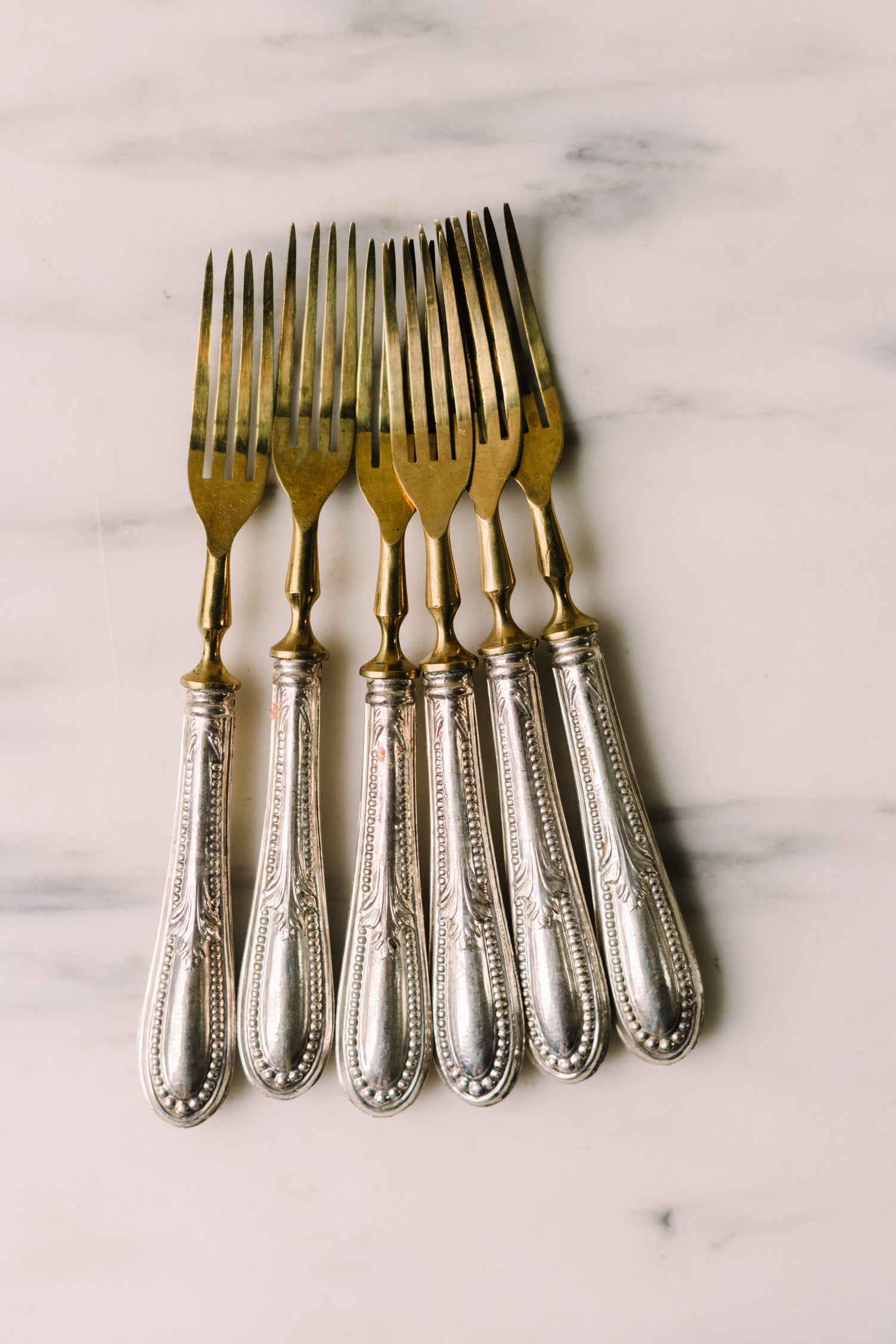 Hailing from the early part of the 20th century, this stunning set of Solingen flatware is the perfect collection for any food or prop stylist. Each handle is crafted from hollowed continental silver and adorned with beading and acanthus designs. Each handle and blade are created from hardy brass. Sold as a set of 11 (5 forks, 6 knives).