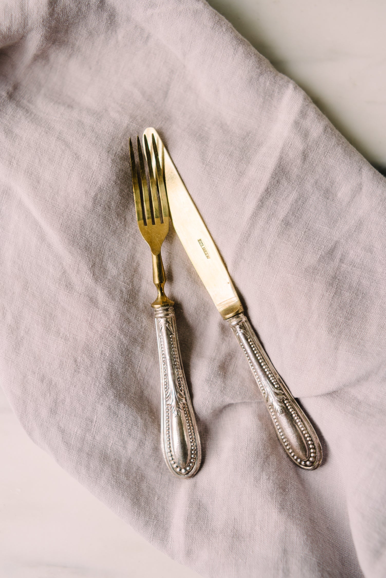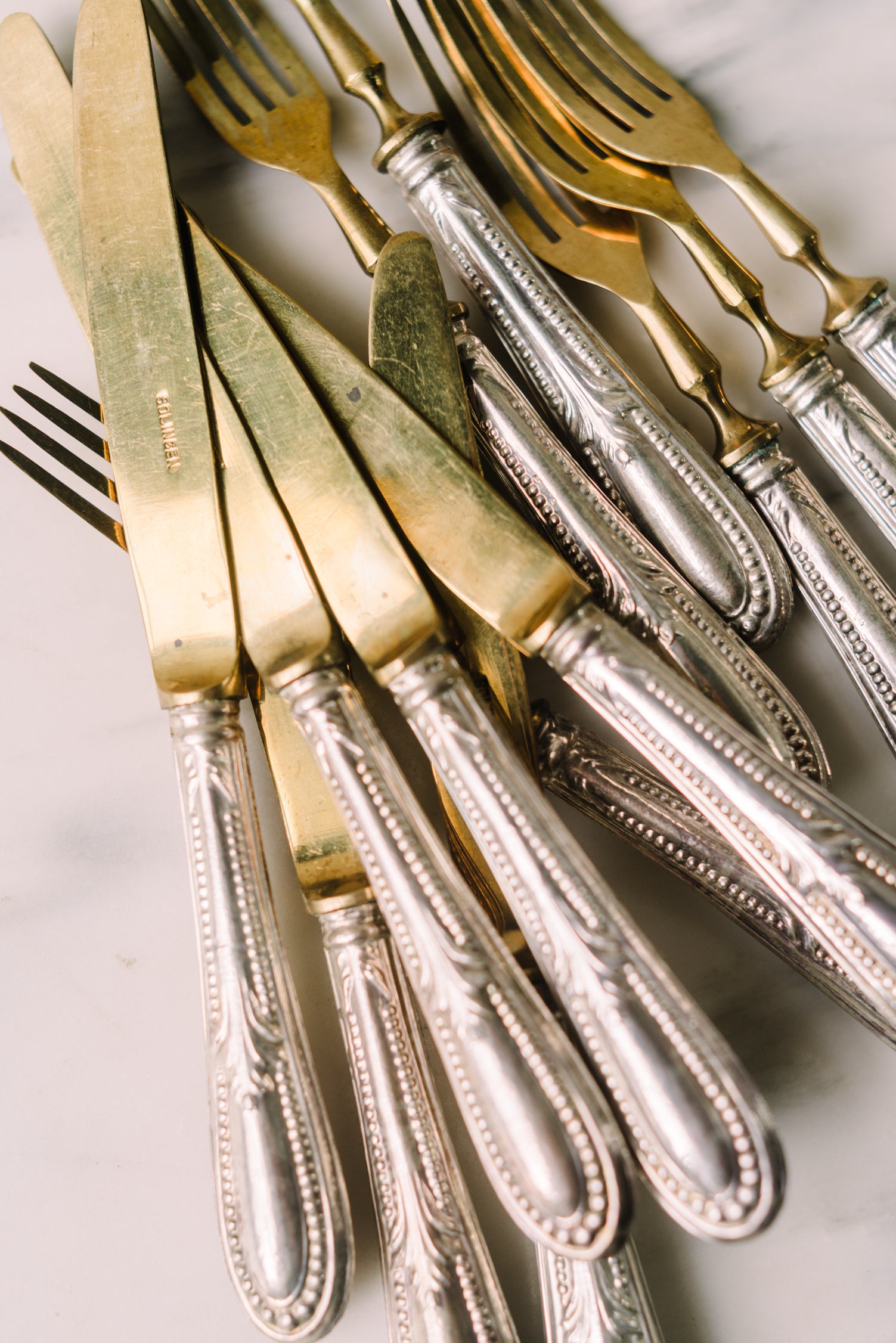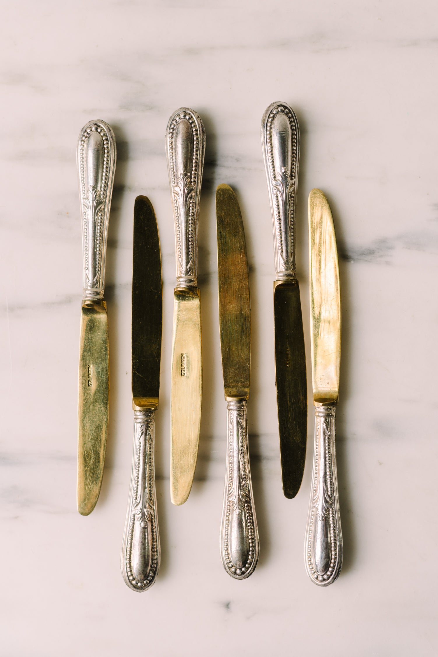 Hailing from the early part of the 20th century, this stunning set of Solingen flatware is the perfect collection for any food or prop stylist. Each handle is crafted from hollowed continental silver and adorned with beading and acanthus designs. Each handle and blade are created from hardy brass. Sold as a set of 11 (5 forks, 6 knives).